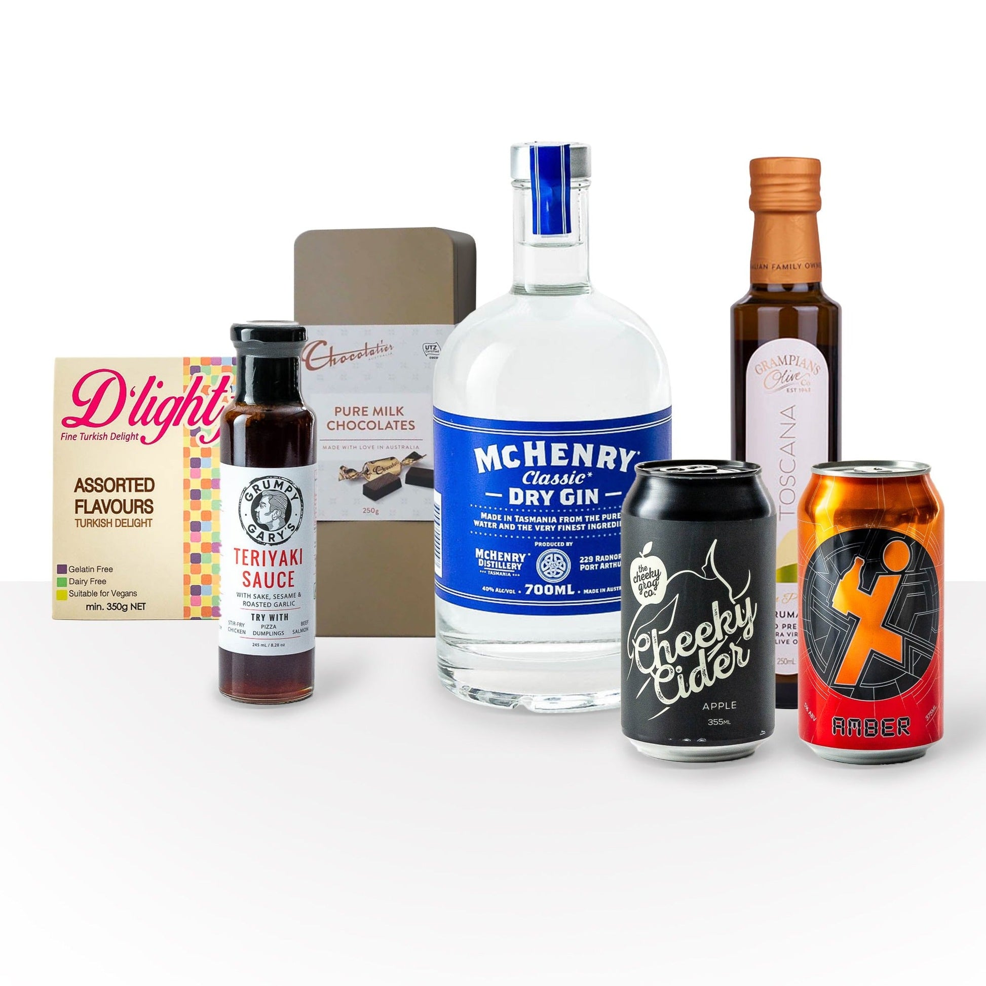 Cheeky Grog Co Cheeky Cider Cans / Chocolatier 250G Twist Wrap Tin / D'lightful Turkish Delight Assorted Flavour Box / Exit Brewing Amber / Grampians Olive Estate lemon pressed evoo / Grumpy Gary's Teriyaki Sauce / McHenry Gin Classic London Dry Gin